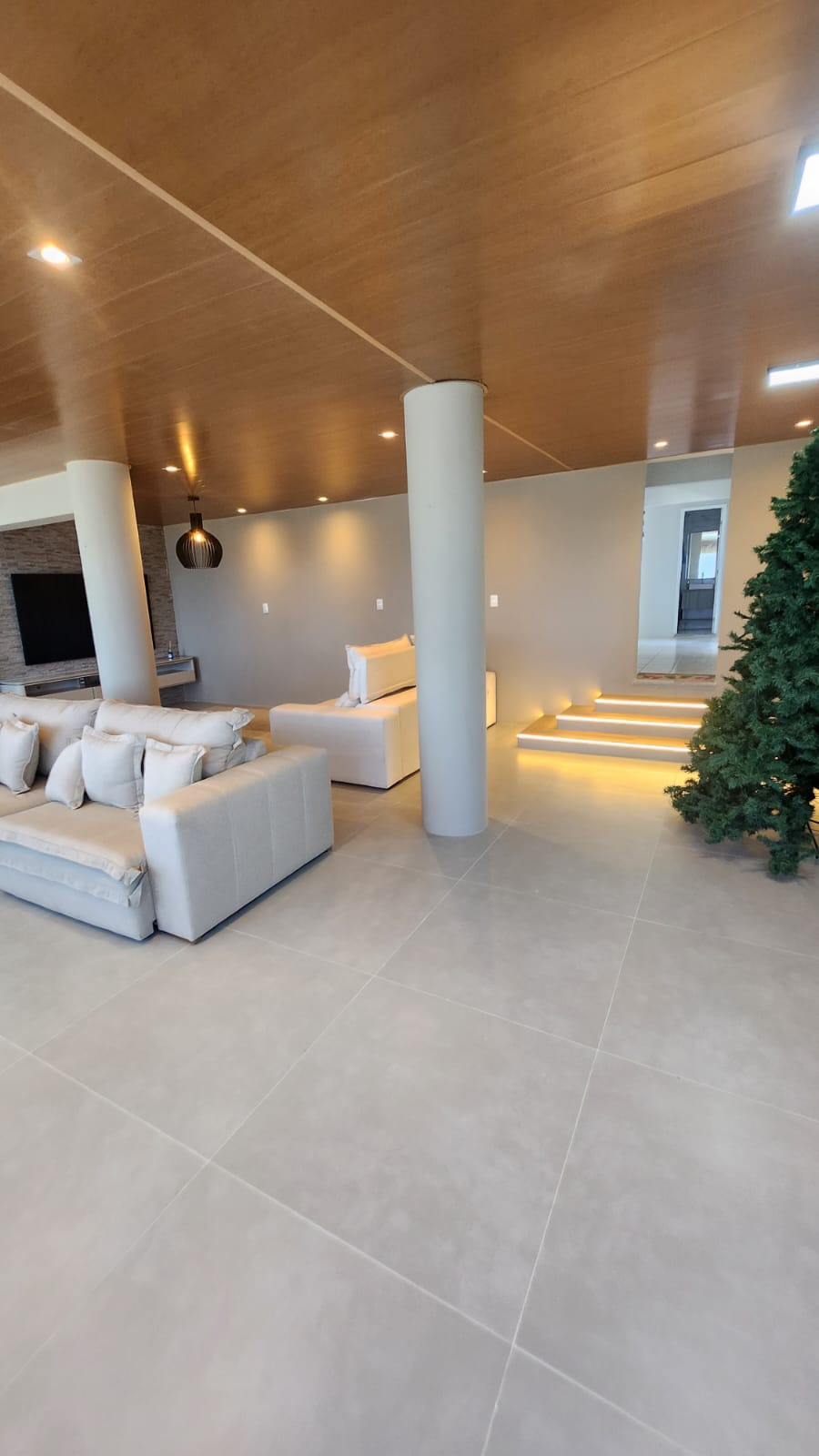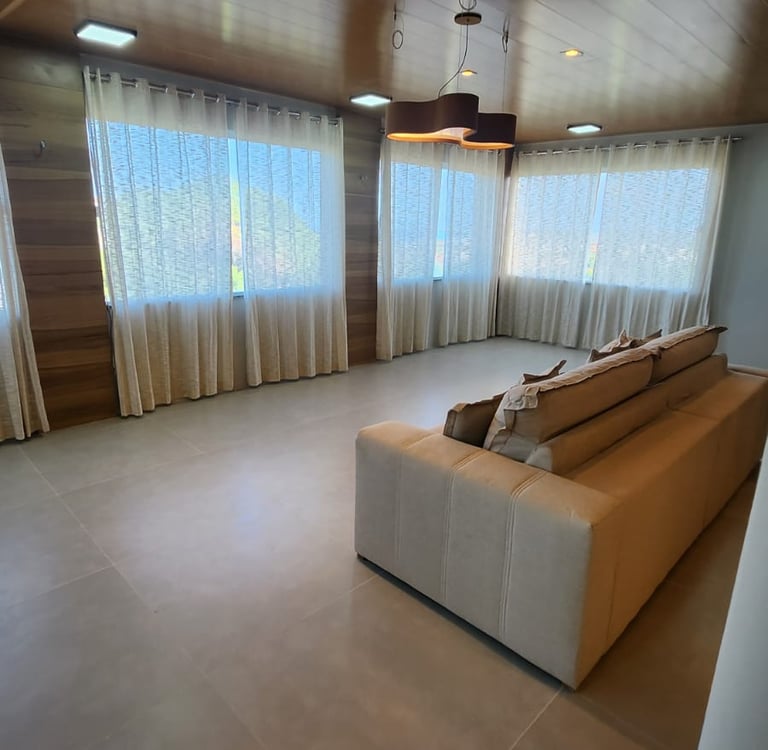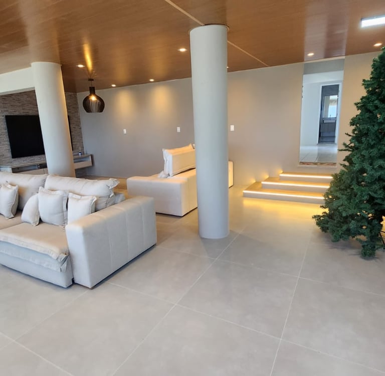Implantada em um terreno de aproximadamente 14.500 m² e com cerca de 730 m² de área construída, a residência foi completamente reconstruída e modernizada, resultando em uma mansão exclusiva com vista panorâmica de 180 graus para o mar.